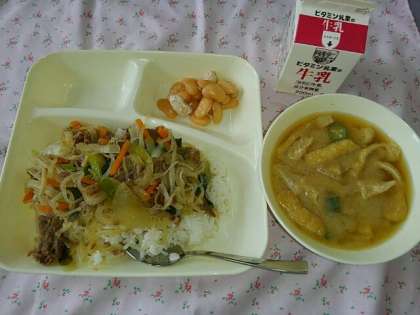 <牛乳 牛丼(ごはん) とうがんのみそ汁 大福豆の煮もの>