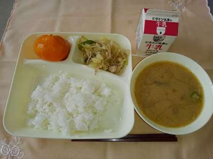 <ごはん 牛乳 ピリ辛野菜炒め オクラとん汁 みかん(冷)>