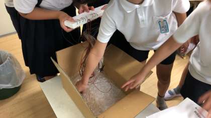 実際、使用されている、サバ漁のしかけを見せ、さわってみると、ハリの大きさや、テグスの太さに、大きくてすごいと驚いていました。