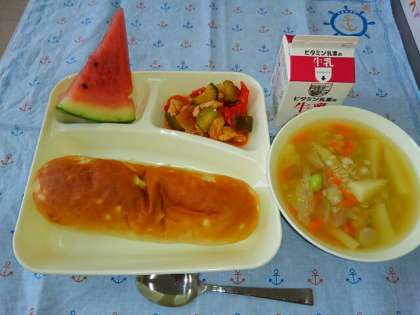 <おさつパン 牛乳 鶏肉と夏野菜のソテー 押麦のスープ すいか>