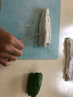 ピーマンをじっくり見て、くぼみやふくらみを作ります。