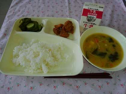 <ごはん 牛乳 豚肉の香味あげ みそ汁 きゅうりの甘酢づけ>