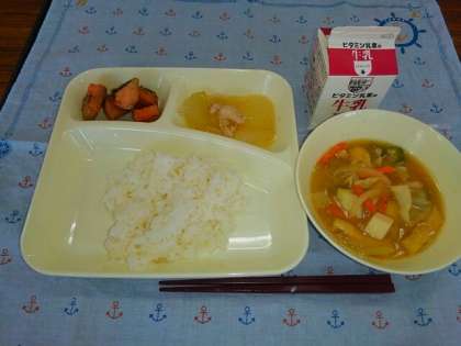 <ごはん 牛乳 さけのつけ焼き みそ汁 とうがんの煮もの>