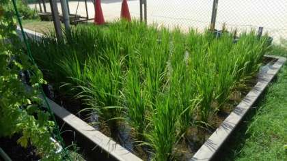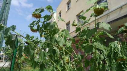 学習園のヒマワリは花の終わりとなり、たくさんの種で重い頭をかしげています。