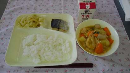 <ごはん 牛乳 さごしの塩焼き じゃがいもと一口がんもの煮もの キャベツのおひたし>
