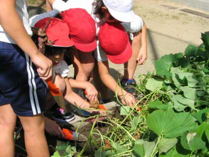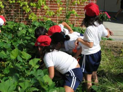 10月8日(水)2年生が学習園でいもほりをしました。学習園いっぱいに伸びたさつまいものつるを引っ張ると、大きないもがたくさん出てきました。中には、かぼちゃのような形のいももありました。子ども達は「うわっ!これ見て!」「とても大きいよ」などと言いながら、いもほりを楽しみました。