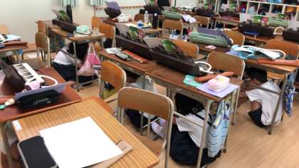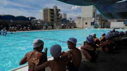 地震速報の放送があると、机の下にもぐります。1・2年生は、ちょうどプール参観の時間帯だったので、プールからあがり、プールサイドで待機しました。