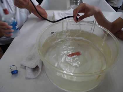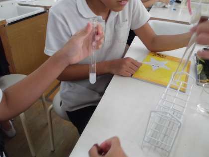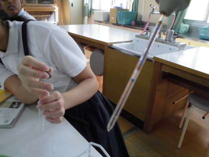 炭酸水から出てくる泡を水上置換で集め、原料名に書いてある二酸化炭素なのかどうか確かめました。火のついたせんこうや石灰水を入れたり、気体検知管で調べたりしました。友だちと協力して手際よく行うことができました。
