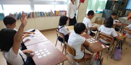 そして、「この筆箱は誰のものでしょう。」と英語でのヒントを聞き、イラストを見て答える問題にもチャレンジしました。