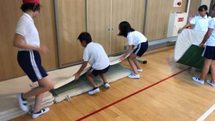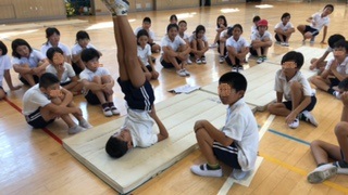 大きな前転は、回り終わるまで足を伸ばしておくのがポイントです。
