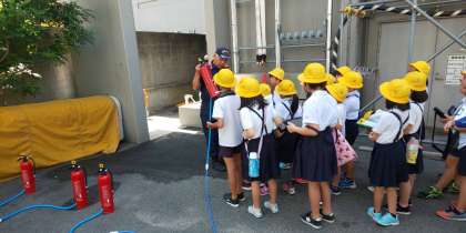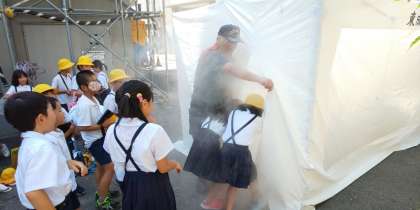 力のない子どもたちでも消火器を使う方法。煙中では袋を被ると、長い時間煙を吸わずに過ごせる方法も教えていただきました。