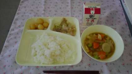 <ごはん 牛乳 鶏肉とさといもの煮もの 豚肉とキャベツのいためもの みたらしだんご>