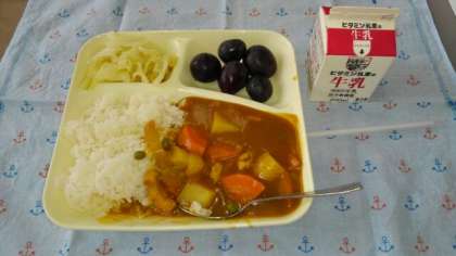 <牛乳 チキンカレーライス[米粉](ごはん) キャベツのピクルス ぶどう(巨峰)>