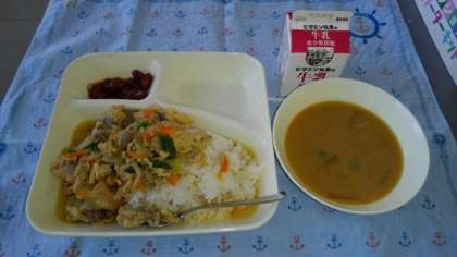 <牛乳 他人丼(ごはん) とうがんのみそ汁 金時豆の煮もの>
