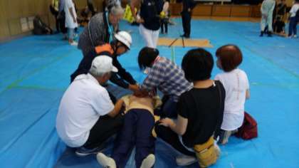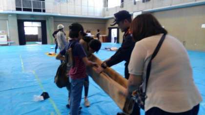 保護者・地域の方々には、AEDや救命の訓練や簡易担架の訓練と、煙くぐりと地震体験車の体験がありました。