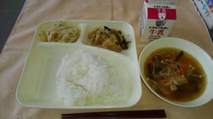 <ごはん 牛乳 鶏肉のごまだれ焼き ソーキ汁 もやしのしょうがじょうゆあえ>