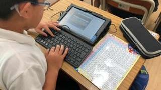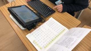 国語の教科書の最後のページを見たり、ローマ字の下敷きを見たりして、打ち込んでいます。