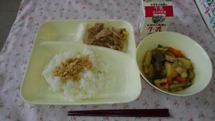 <ごはん 牛乳 豚肉のねぎじょうゆ焼き ふきよせ煮 ツナ大豆そぼろ>