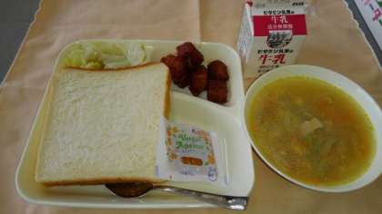 <食パン 牛乳 まぐろのオーロラ煮 ベーコンとじゃがいものスープ キャベツのゆずドレッシング アプリコットジャム>