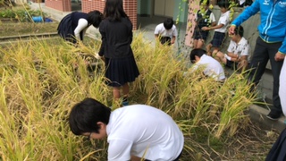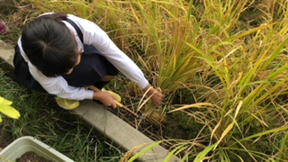 片手で根元をしっかりと持ち、かまを当てて刈り取ります。