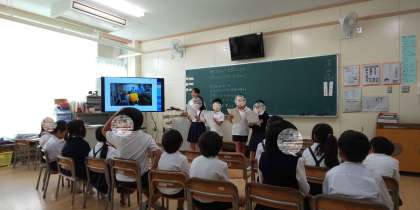 2年生は、授業参観で「町たんけん」に行って、見学したことやインタビューしたことを発表しました。クイズも作って、みんなに答えてもらいました。