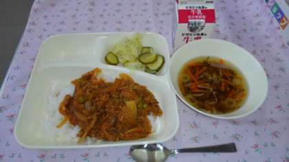 <牛乳 タコライス(ごはん) もずくと白ねぎのスープ キャベツときゅうりのサラダ>