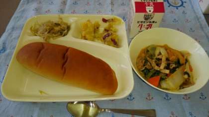 <大型黒糖パン 牛乳 豚肉といかの中華煮 焼きさつまいもの甘みつかけ もやしとピーマンのいためもの>
