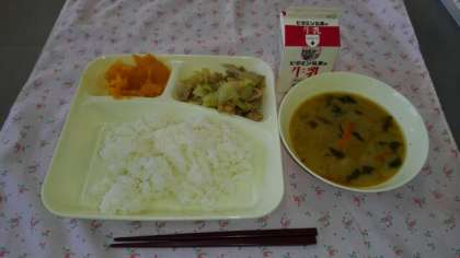 <ごはん 牛乳 豚肉とまいたけのいためもの つみれ汁 かぼちゃういろう>