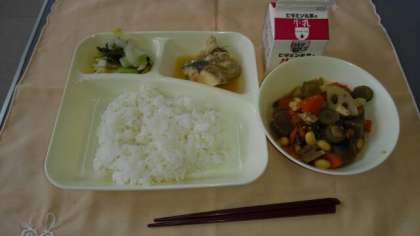 <ごはん 牛乳 さごしのおろしじょうゆかけ 五目豆 こまつなと白菜の甘酢あえ>