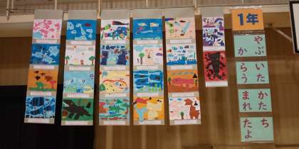 1年生は「やぶいたかたちからうまれたよ」と「たいせつな人にスペシャルパフェを」という二つの作品を作りました。