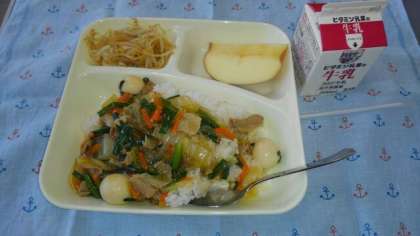<牛乳 中華丼(ごはん) もやしの中華あえ りんご>