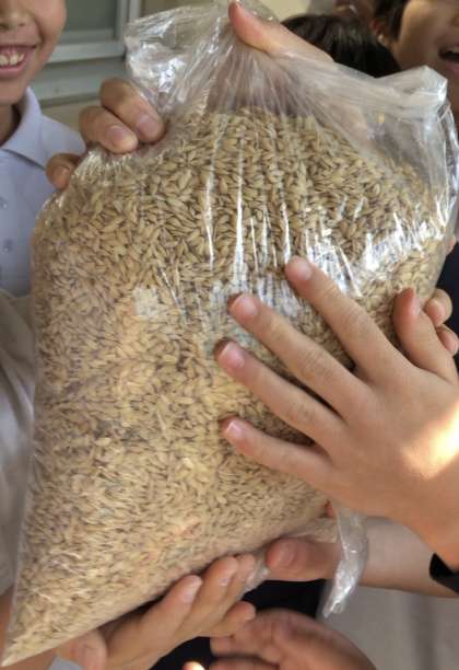 とれた稲は、自分たちの顔よりも大きく、みんなでさわって驚いていました。