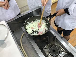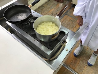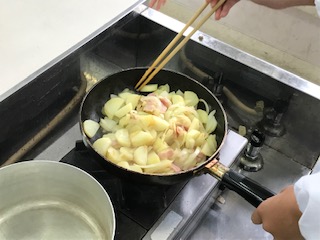 ジャガイモをゆで、玉ねぎとベーコンを炒めます。両方に火が通ったら、ジャガイモをフライパンへ。