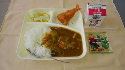 <牛乳 えびフライカレーライス(ごはん) カリフラワーのピクルス 豆こんぶ>