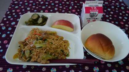 <パン(1/2) 牛乳 オイスターソース焼きそば きゅうりの中華和え りんご>