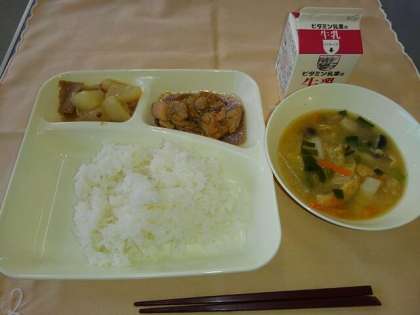 <ごはん 牛乳 鶏肉の甘辛焼き みそ汁 だいこんの煮もの>