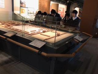 土器を見たり難波宮の模型を見たり。みんな、熱心に見入っています。
