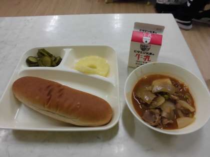 今日の献立は 黒糖パン・牛乳・ビーフシチュー・パインアップル(缶)・きゅうりのバジル風味サラダです。