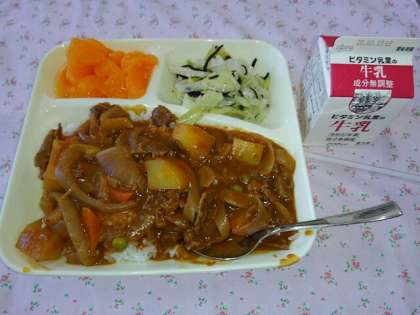 <牛乳 ハヤシライス キャベツのひじきドレッシング みかん(缶)>