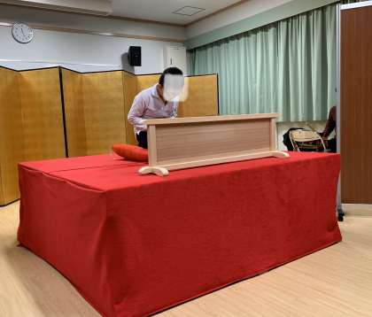 最後は、お囃子がなる中、舞台に上がり自己紹介をするという体験をしました。小拍子を台に打ち、良い音を鳴らしてしっかり名前を言うことができました。
