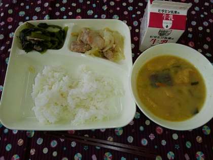 <ごはん 牛乳 鶏肉のゆず塩焼き さつまいものみそ汁 こまつなの煮びたし>