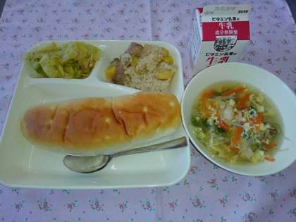 <おさつパン 牛乳 中華おこわ 卵スープ キャベツのオイスターソースいため>