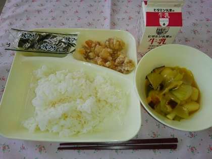 <ごはん 牛乳 鶏肉のからあげ まる天と野菜のうま煮 焼きのり>
