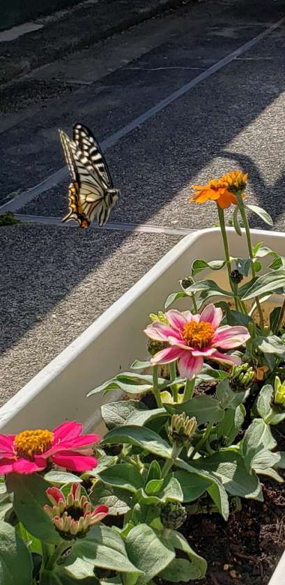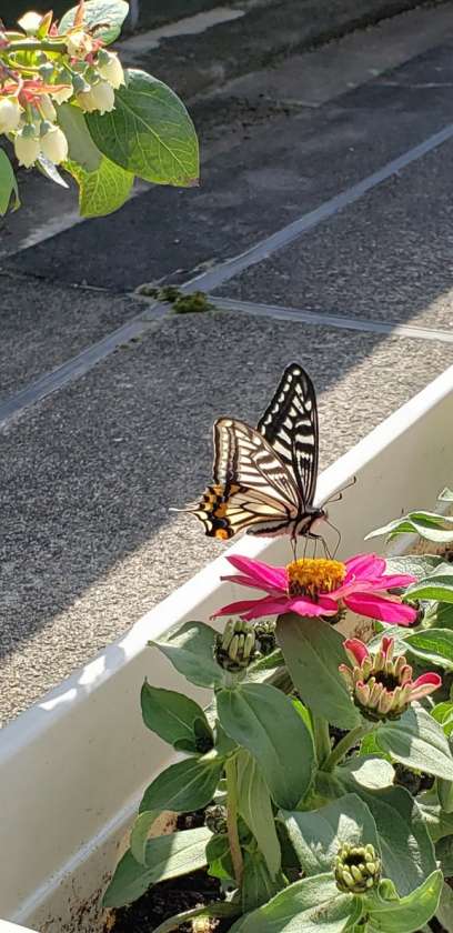 自宅のバルコニーのお花に、アゲハチョウが蜜を吸いに来ました。