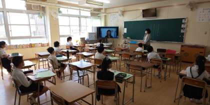新型コロナウィルス感染拡大防止のため、職員室から各教室に遠隔での朝会を行いました。その中で、今年度から新しく今里小学校に来られた先生の紹介がありました。