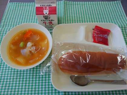 <牛乳 大型コッペパン フレッシュトマトのスープ煮 いちごジャム>