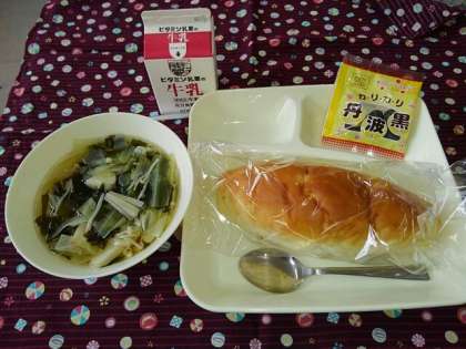 <牛乳 おさつパン すまし汁 いり黒大豆>