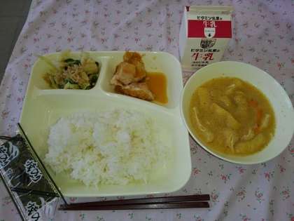 <牛乳 ごはん 鶏肉のおろしじょうゆかけ みそ汁 野菜いため 焼きのり>