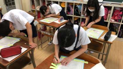 防災について調べたことや家での取り組みを書いたポスターをみんなで読み合いました。