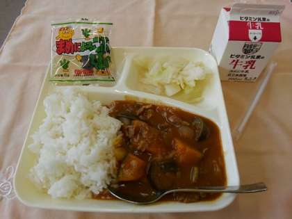 <牛乳 夏野菜のカレーライス キャベツのサラダ 豆こんぶ>